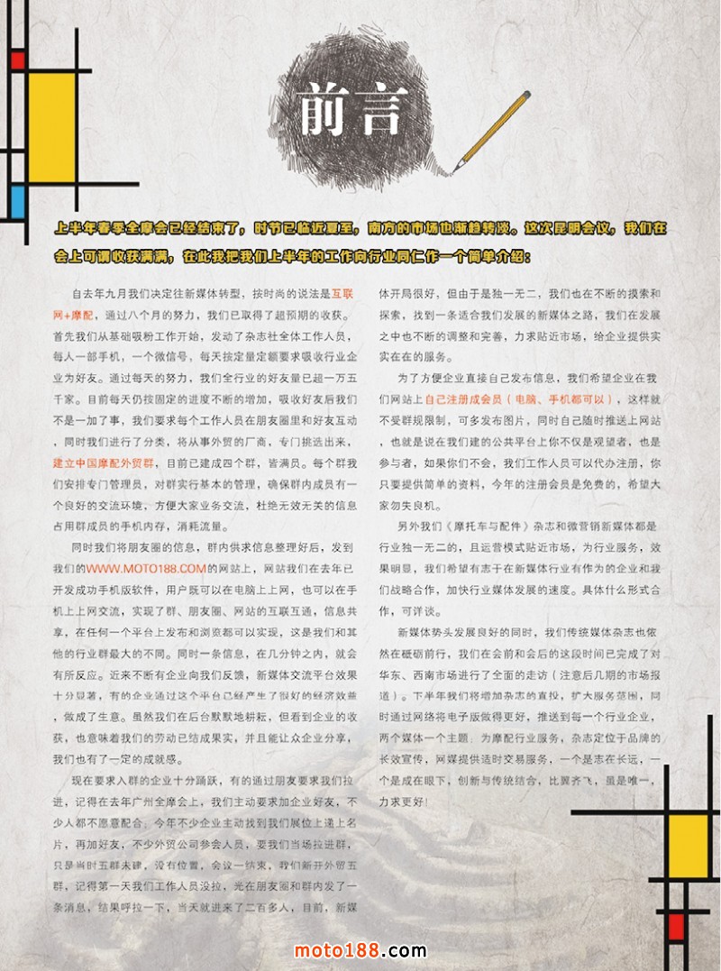 新媒體勢(shì)頭發(fā)展良好的同時(shí),我們傳統(tǒng)媒體雜志也依然在砥礪前行,我們?cè)跁?huì)前和會(huì)后的這段時(shí)間已完成了對(duì)華東、西南市場(chǎng)進(jìn)行了全面的走訪(注意后幾期的市場(chǎng)報(bào)道)。下半年我們將增加雜志的直投,擴(kuò)大服務(wù)范圍,同時(shí)通過(guò)網(wǎng)絡(luò)將電子版做得更好,推送到每一個(gè)行業(yè)企業(yè),兩個(gè)媒體一個(gè)主題:為摩配行業(yè)服務(wù),雜志定位于品牌的長(zhǎng)效宣傳,網(wǎng)媒提供適時(shí)交易服務(wù),一個(gè)是志在長(zhǎng)遠(yuǎn),一個(gè)是成在眼下,創(chuàng)新與傳統(tǒng)結(jié)合,比翼齊飛,雖是唯一,力求更好!