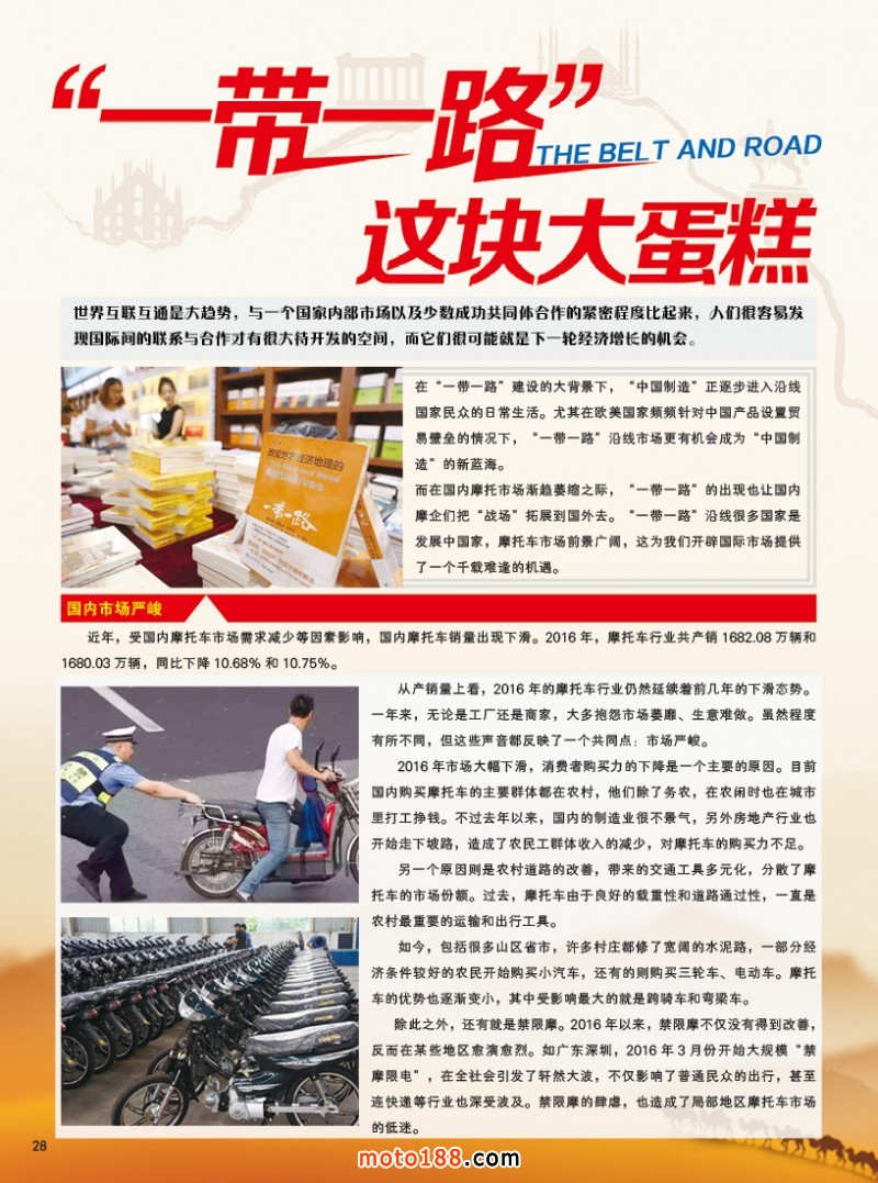 2017.6月《摩托車/電動(dòng)車與配件》雜志,歡迎大家閱讀日期:2017-06-02 點(diǎn)擊:1297 查看原圖 全部展開![]() ![]() ![]() 內(nèi)28 “一帶一路”這塊大蛋糕 國內(nèi)摩企怎樣才能吃得下