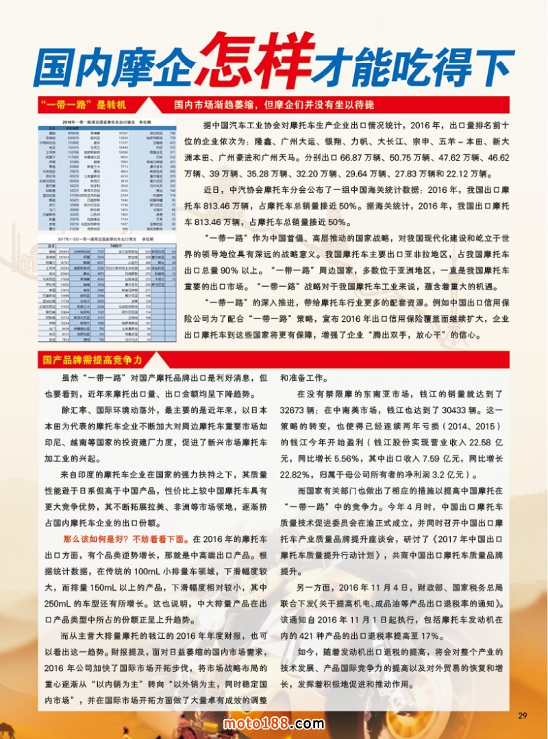 2017.6月《摩托車/電動(dòng)車與配件》雜志,歡迎大家閱讀日期:2017-06-02 點(diǎn)擊:1297 查看原圖 全部展開![]() ![]() ![]() 內(nèi)29 “一帶一路”這塊大蛋糕 國(guó)內(nèi)摩企怎樣才能吃得下