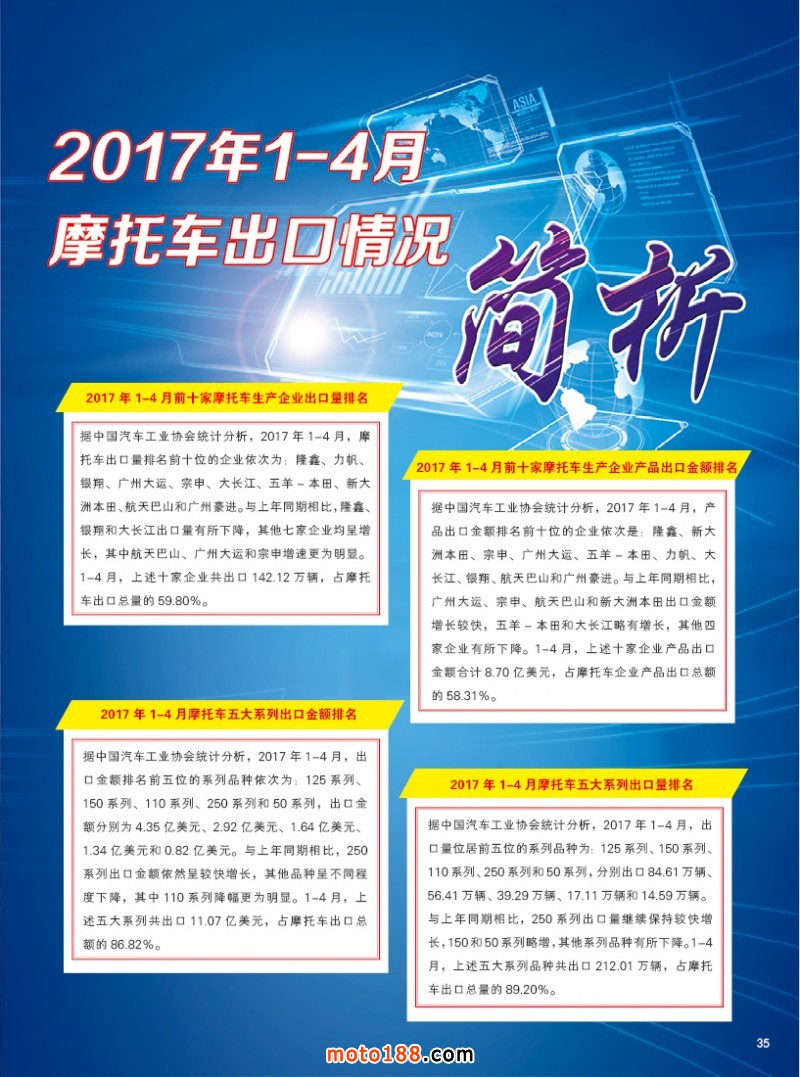 2017.6月《摩托車/電動(dòng)車與配件》雜志,歡迎大家閱讀日期:2017-06-02 點(diǎn)擊:1297 查看原圖 全部展開![]() ![]() ![]() 內(nèi)35 2017年1-4月摩托車出口情況簡析