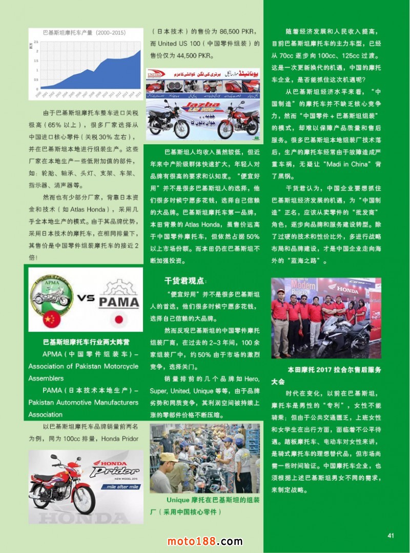 2017.6月《摩托車/電動(dòng)車與配件》雜志,歡迎大家閱讀日期:2017-06-02 點(diǎn)擊:1297 查看原圖 全部展開![]() ![]() ![]() 內(nèi)41 巴基斯坦摩托車行業(yè)背后的“中日大戰(zhàn)”
