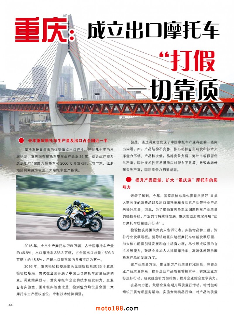 2017.6月《摩托車/電動車與配件》雜志,歡迎大家閱讀日期:2017-06-02 點擊:1297 查看原圖 全部展開![]() ![]() ![]() 內(nèi)44 重慶成立出口摩托車“打假聯(lián)盟”,一切靠質(zhì)量說話