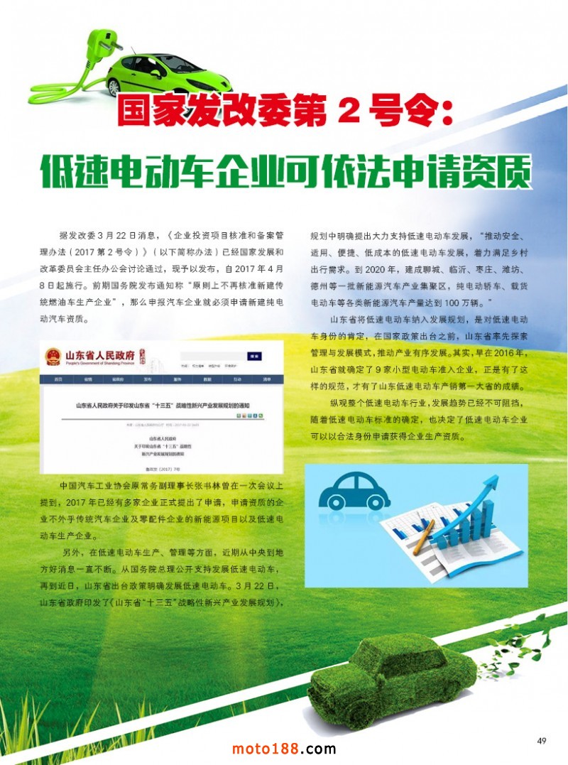2017.6月《摩托車/電動車與配件》雜志,歡迎大家閱讀日期:2017-06-02 點(diǎn)擊:1297 查看原圖 全部展開![]() ![]() ![]() 內(nèi)49 國家發(fā)改委第2號令:低速電動車企業(yè)可依法申請資質(zhì)