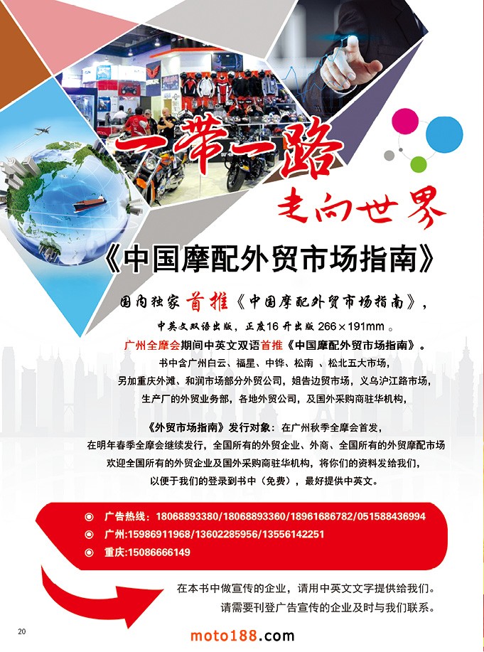 今年十一月份中汽全摩會繼續(xù)在廣州召開,為了做好外貿服務工作,抓住一帶一路走向世界的發(fā)展契機,我們將我們的外貿數(shù)據(jù)庫整理發(fā)布給業(yè)內人士,在廣州全摩會正式推出首版《中國摩配外貿市場指南》,用中英文雙語出版,正度16開,尺寸為266×181毫米。