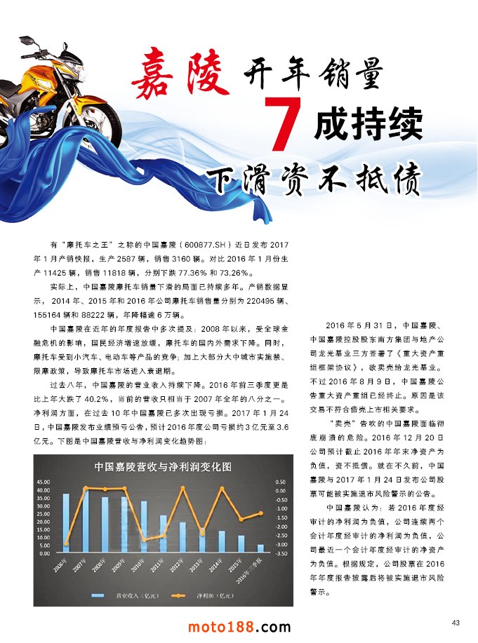 2017.8月《摩托車/電動(dòng)車與配件》雜志,歡迎大家閱讀日期:2017-07-31 點(diǎn)擊:2382 查看原圖 全部展開![]() ![]() ![]() 內(nèi)43 嘉陵開年銷量7成持續(xù)下滑資不抵債