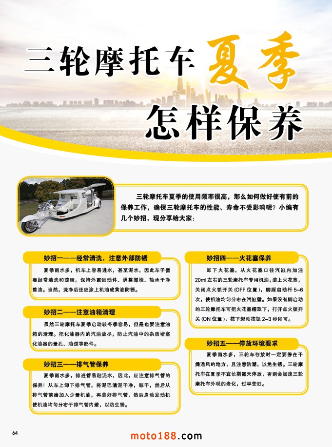2017.8月《摩托車/電動車與配件》雜志,歡迎大家閱讀日期:2017-07-31 點擊:2382 查看原圖 全部展開![]() ![]() ![]() 內(nèi)64 三輪摩托車夏季怎樣保養(yǎng)和使用?