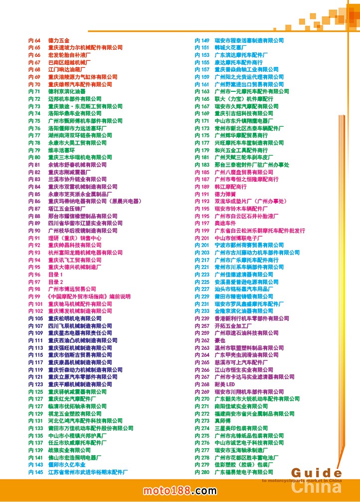 《中國摩托車配件外貿(mào)市場指南》和我們以前所編的《國內(nèi)六大地區(qū)的市場指南》有所不同,具有如下的特點: