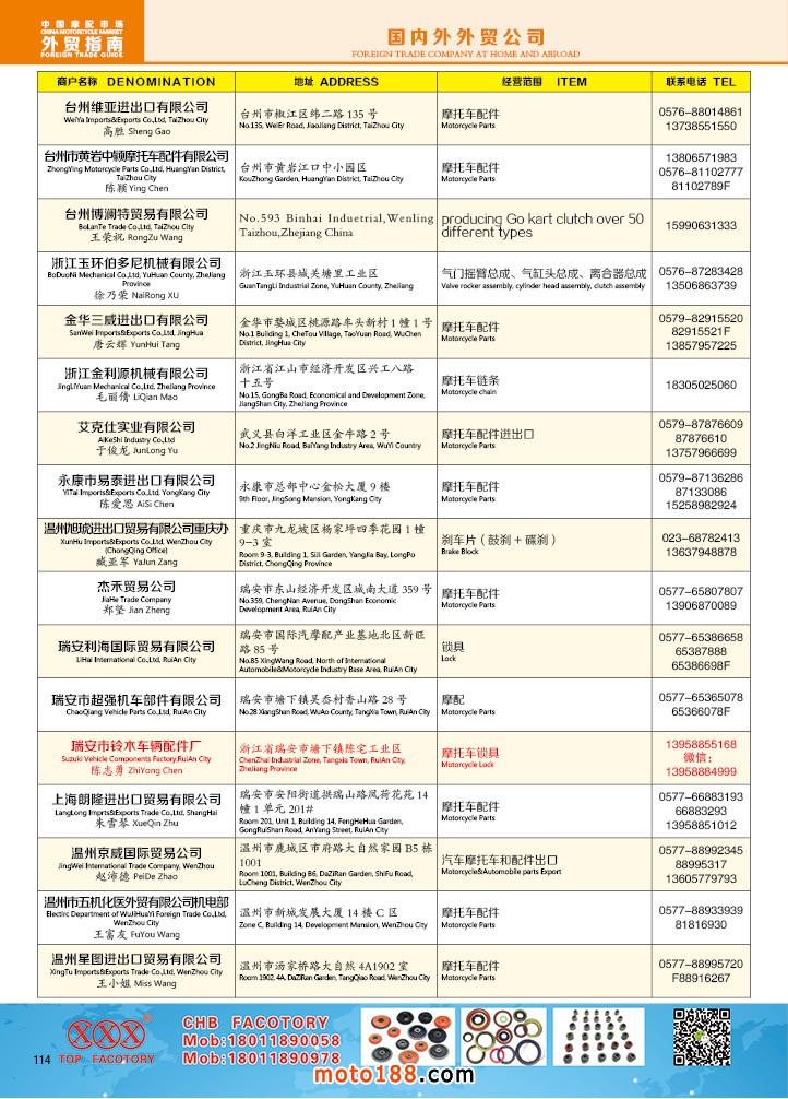 由《摩托車(chē)與配件》雜志社,在國(guó)內(nèi)首次獨(dú)家推出的《中國(guó)摩托車(chē)配件外貿(mào)市場(chǎng)指南》工具書(shū)正式面世。這是一本專業(yè)定位于外貿(mào)企業(yè)的工具書(shū),隨著一帶一路發(fā)展戰(zhàn)略的推進(jìn),更多企業(yè)走出國(guó)門(mén),將產(chǎn)品銷(xiāo)往世界各地,本書(shū)收集了國(guó)內(nèi)主要從事摩托車(chē)配件外貿(mào)的工廠、商家、國(guó)外部分駐華采購(gòu)機(jī)構(gòu)等資料匯總而成.