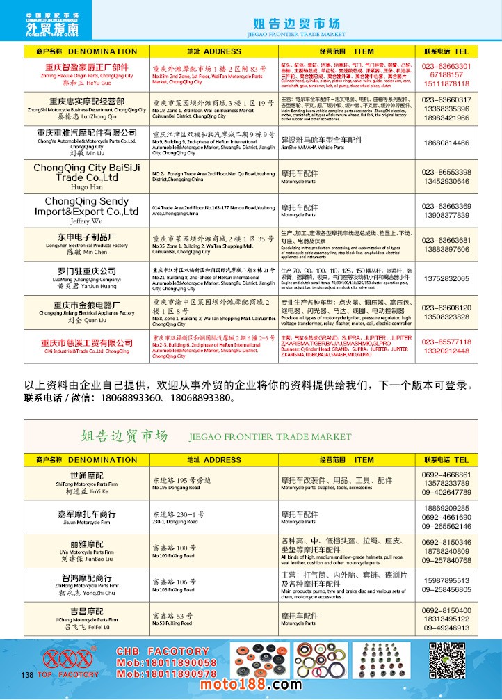 由《摩托車與配件》雜志社,在國內(nèi)首次獨家推出的《中國摩托車配件外貿(mào)市場指南》工具書正式面世。這是一本專業(yè)定位于外貿(mào)企業(yè)的工具書,隨著一帶一路發(fā)展戰(zhàn)略的推進,更多企業(yè)走出國門,將產(chǎn)品銷往世界各地,本書收集了國內(nèi)主要從事摩托車配件外貿(mào)的工廠、商家、國外部分駐華采購機構等資料匯總而成.