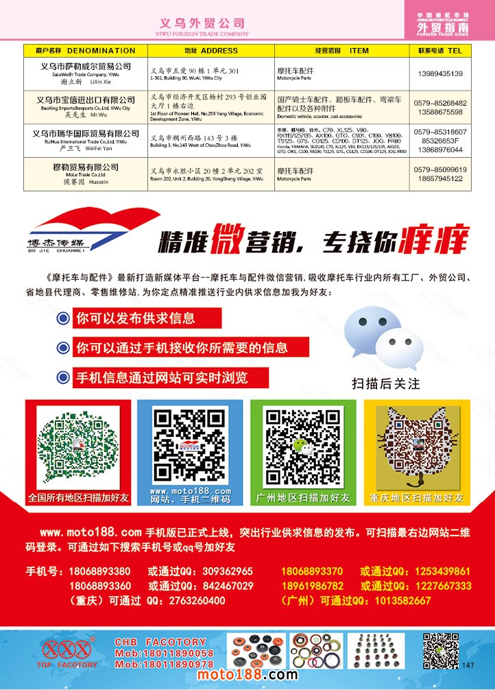 由《摩托車與配件》雜志社,在國內(nèi)首次獨(dú)家推出的《中國摩托車配件外貿(mào)市場指南》工具書正式面世。這是一本專業(yè)定位于外貿(mào)企業(yè)的工具書,隨著一帶一路發(fā)展戰(zhàn)略的推進(jìn),更多企業(yè)走出國門,將產(chǎn)品銷往世界各地,本書收集了國內(nèi)主要從事摩托車配件外貿(mào)的工廠、商家、國外部分駐華采購機(jī)構(gòu)等資料匯總而成.