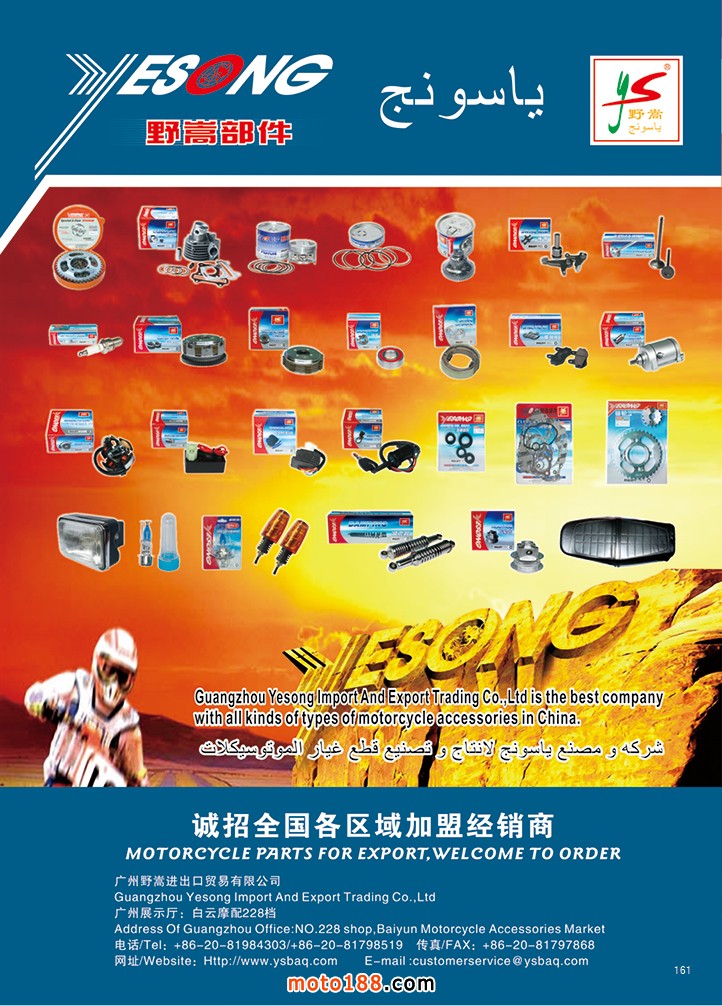由《摩托車與配件》雜志社,在國內(nèi)首次獨家推出的《中國摩托車配件外貿(mào)市場指南》工具書正式面世。這是一本專業(yè)定位于外貿(mào)企業(yè)的工具書,隨著一帶一路發(fā)展戰(zhàn)略的推進(jìn),更多企業(yè)走出國門,將產(chǎn)品銷往世界各地,本書收集了國內(nèi)主要從事摩托車配件外貿(mào)的工廠、商家、國外部分駐華采購機(jī)構(gòu)等資料匯總而成.