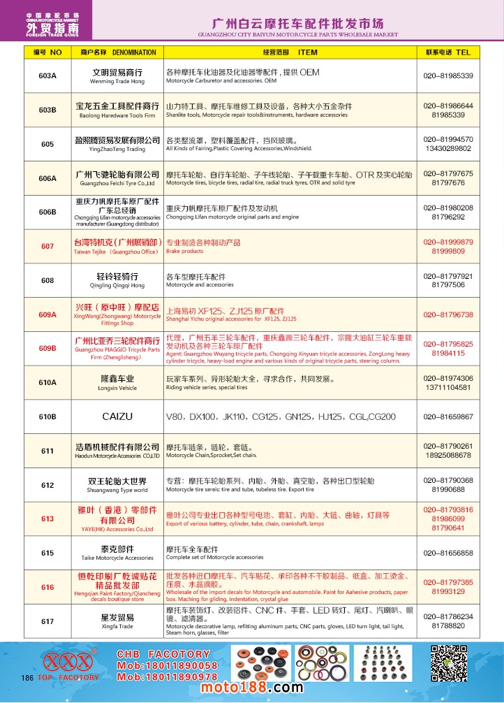 由《摩托車與配件》雜志社,在國內(nèi)首次獨(dú)家推出的《中國摩托車配件外貿(mào)市場指南》工具書正式面世。這是一本專業(yè)定位于外貿(mào)企業(yè)的工具書,隨著一帶一路發(fā)展戰(zhàn)略的推進(jìn),更多企業(yè)走出國門,將產(chǎn)品銷往世界各地,本書收集了國內(nèi)主要從事摩托車配件外貿(mào)的工廠、商家、國外部分駐華采購機(jī)構(gòu)等資料匯總而成.