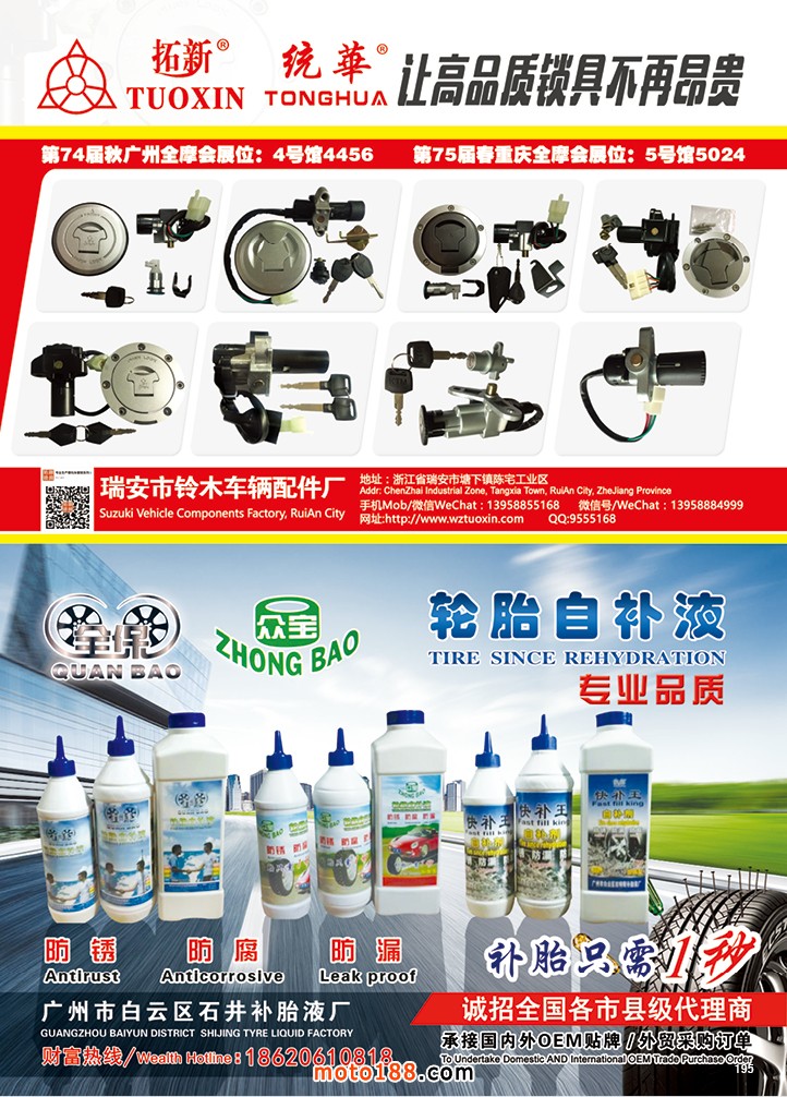 由《摩托車與配件》雜志社,在國內(nèi)首次獨家推出的《中國摩托車配件外貿(mào)市場指南》工具書正式面世。這是一本專業(yè)定位于外貿(mào)企業(yè)的工具書,隨著一帶一路發(fā)展戰(zhàn)略的推進,更多企業(yè)走出國門,將產(chǎn)品銷往世界各地,本書收集了國內(nèi)主要從事摩托車配件外貿(mào)的工廠、商家、國外部分駐華采購機構等資料匯總而成.