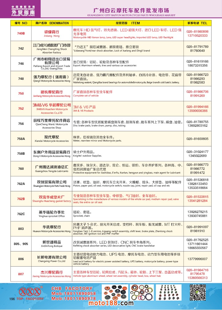 由《摩托車與配件》雜志社,在國內(nèi)首次獨家推出的《中國摩托車配件外貿(mào)市場指南》工具書正式面世。這是一本專業(yè)定位于外貿(mào)企業(yè)的工具書,隨著一帶一路發(fā)展戰(zhàn)略的推進(jìn),更多企業(yè)走出國門,將產(chǎn)品銷往世界各地,本書收集了國內(nèi)主要從事摩托車配件外貿(mào)的工廠、商家、國外部分駐華采購機(jī)構(gòu)等資料匯總而成.