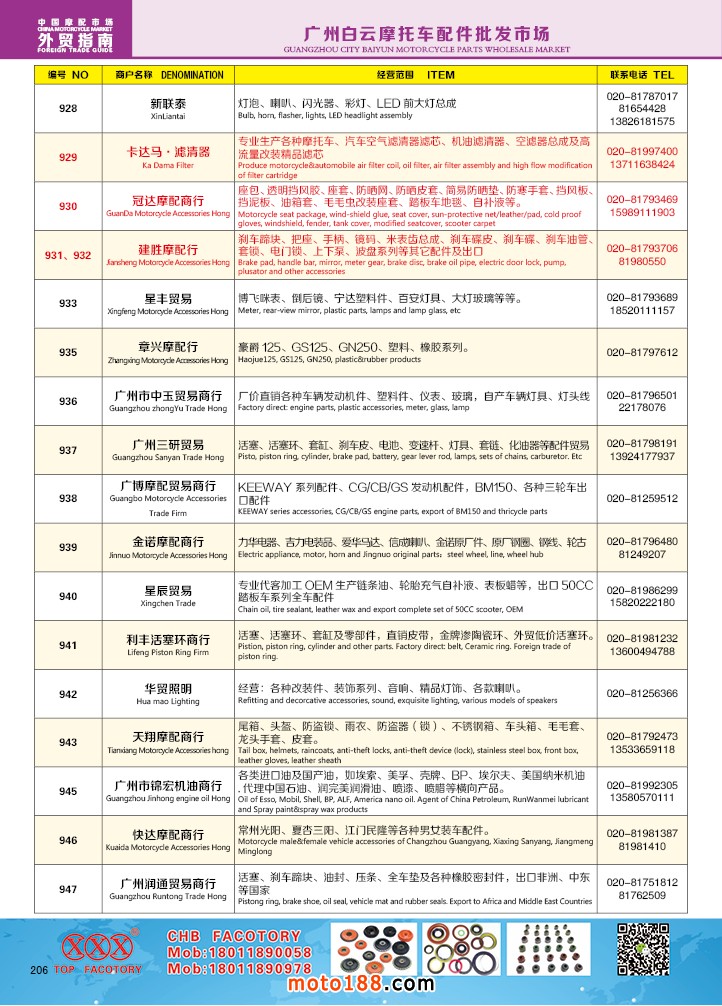 由《摩托車與配件》雜志社,在國內(nèi)首次獨家推出的《中國摩托車配件外貿(mào)市場指南》工具書正式面世。這是一本專業(yè)定位于外貿(mào)企業(yè)的工具書,隨著一帶一路發(fā)展戰(zhàn)略的推進,更多企業(yè)走出國門,將產(chǎn)品銷往世界各地,本書收集了國內(nèi)主要從事摩托車配件外貿(mào)的工廠、商家、國外部分駐華采購機構(gòu)等資料匯總而成.