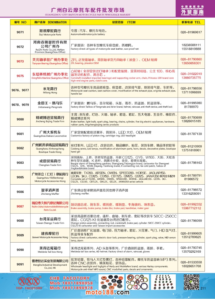 由《摩托車與配件》雜志社,在國內(nèi)首次獨家推出的《中國摩托車配件外貿(mào)市場指南》工具書正式面世。這是一本專業(yè)定位于外貿(mào)企業(yè)的工具書,隨著一帶一路發(fā)展戰(zhàn)略的推進,更多企業(yè)走出國門,將產(chǎn)品銷往世界各地,本書收集了國內(nèi)主要從事摩托車配件外貿(mào)的工廠、商家、國外部分駐華采購機構等資料匯總而成.