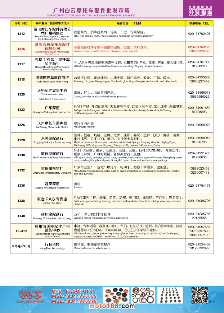 由《摩托車與配件》雜志社,在國內(nèi)首次獨(dú)家推出的《中國摩托車配件外貿(mào)市場指南》工具書正式面世。這是一本專業(yè)定位于外貿(mào)企業(yè)的工具書,隨著一帶一路發(fā)展戰(zhàn)略的推進(jìn),更多企業(yè)走出國門,將產(chǎn)品銷往世界各地,本書收集了國內(nèi)主要從事摩托車配件外貿(mào)的工廠、商家、國外部分駐華采購機(jī)構(gòu)等資料匯總而成.