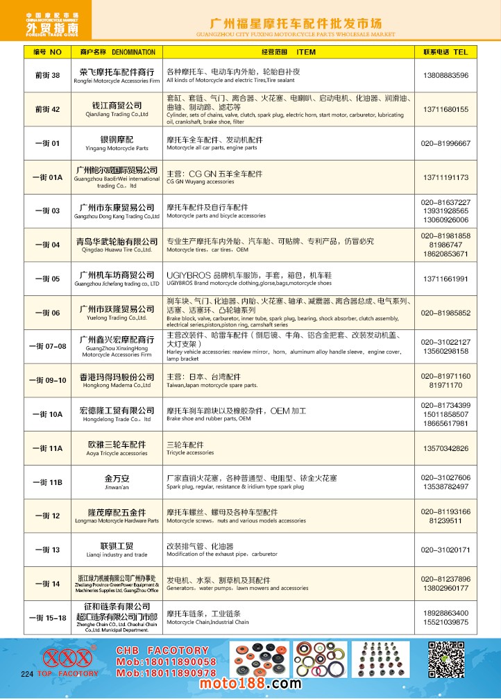 由《摩托車與配件》雜志社,在國內(nèi)首次獨家推出的《中國摩托車配件外貿(mào)市場指南》工具書正式面世。這是一本專業(yè)定位于外貿(mào)企業(yè)的工具書,隨著一帶一路發(fā)展戰(zhàn)略的推進,更多企業(yè)走出國門,將產(chǎn)品銷往世界各地,本書收集了國內(nèi)主要從事摩托車配件外貿(mào)的工廠、商家、國外部分駐華采購機構(gòu)等資料匯總而成.