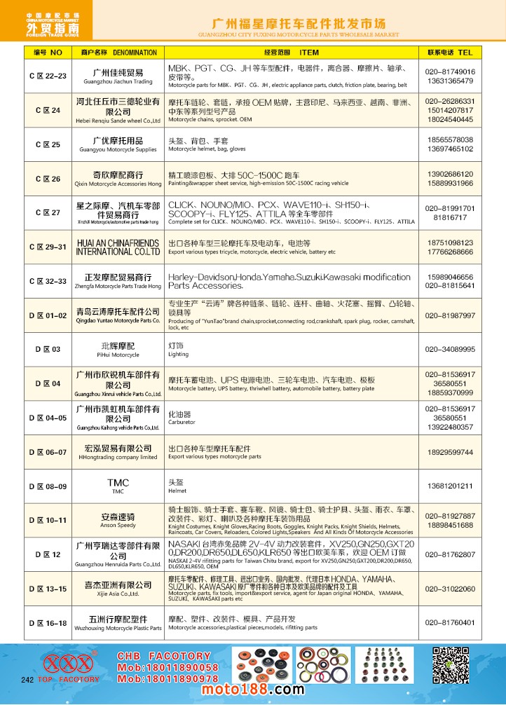 由《摩托車與配件》雜志社,在國內(nèi)首次獨(dú)家推出的《中國摩托車配件外貿(mào)市場指南》工具書正式面世。這是一本專業(yè)定位于外貿(mào)企業(yè)的工具書,隨著一帶一路發(fā)展戰(zhàn)略的推進(jìn),更多企業(yè)走出國門,將產(chǎn)品銷往世界各地,本書收集了國內(nèi)主要從事摩托車配件外貿(mào)的工廠、商家、國外部分駐華采購機(jī)構(gòu)等資料匯總而成.