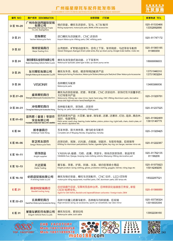 由《摩托車與配件》雜志社,在國內(nèi)首次獨(dú)家推出的《中國摩托車配件外貿(mào)市場指南》工具書正式面世。這是一本專業(yè)定位于外貿(mào)企業(yè)的工具書,隨著一帶一路發(fā)展戰(zhàn)略的推進(jìn),更多企業(yè)走出國門,將產(chǎn)品銷往世界各地,本書收集了國內(nèi)主要從事摩托車配件外貿(mào)的工廠、商家、國外部分駐華采購機(jī)構(gòu)等資料匯總而成.
