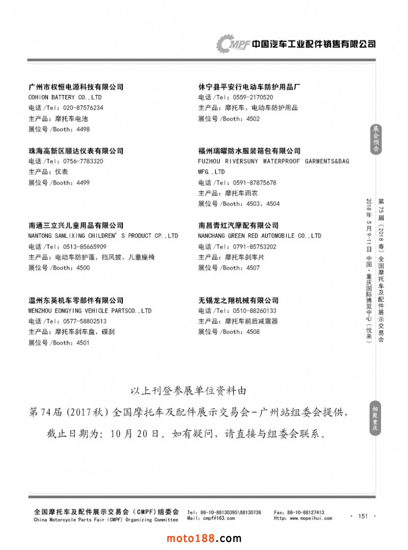 內(nèi)151 第74屆(2017秋)全國摩托車及配件展示交易會-廣州站參展企業(yè)名錄