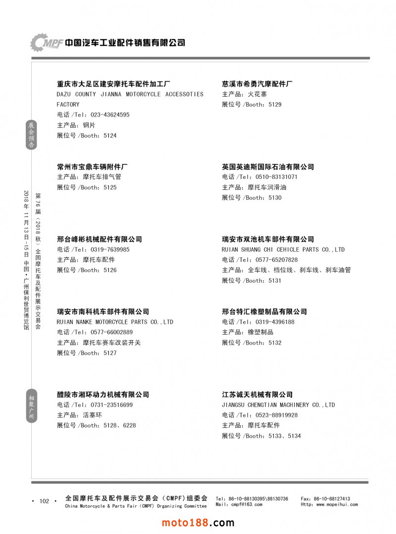 內102 第75屆(2018春)全國摩托車及配件展示交易會-重慶站參展企業(yè)信息