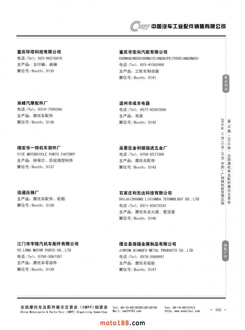 內103 第75屆(2018春)全國摩托車及配件展示交易會-重慶站參展企業(yè)信息