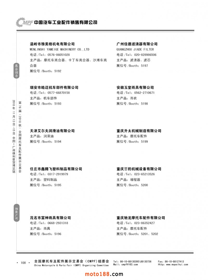 內(nèi)108 第75屆(2018春)全國摩托車及配件展示交易會-重慶站參展企業(yè)信息