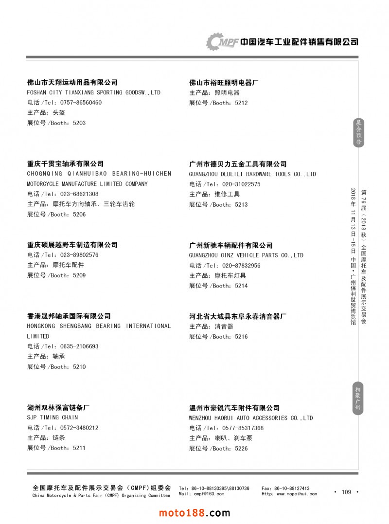 內(nèi)109 第75屆(2018春)全國(guó)摩托車及配件展示交易會(huì)-重慶站參展企業(yè)信息