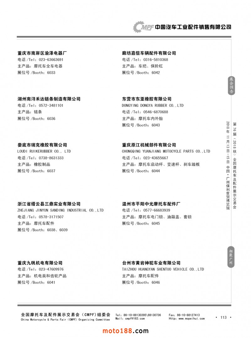 內(nèi)113 第75屆(2018春)全國(guó)摩托車及配件展示交易會(huì)-重慶站參展企業(yè)信息