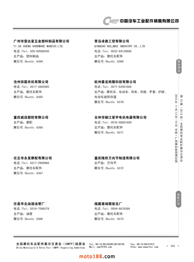 內(nèi)141 第75屆(2018春)全國摩托車及配件展示交易會-重慶站參展企業(yè)信息