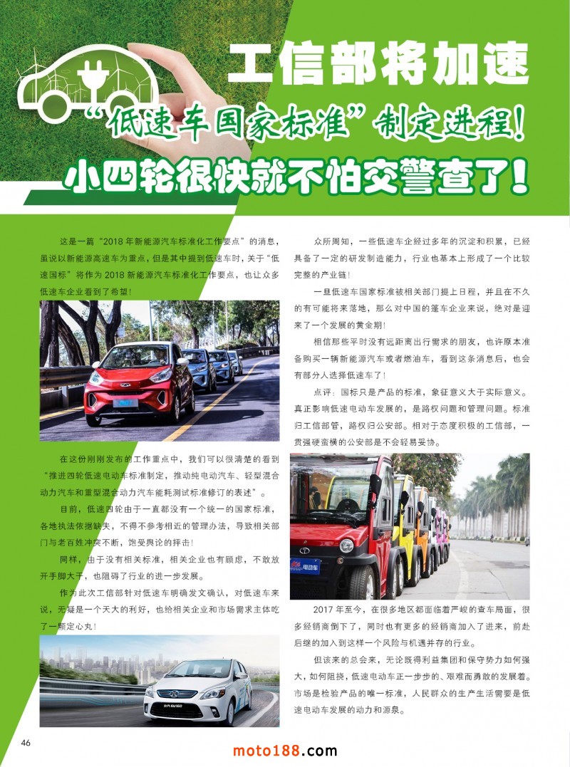 2018.5月《摩托車/電動(dòng)車與配件》雜志,歡迎大家閱讀日期:2018-04-25 點(diǎn)擊:1896 查看原圖 全部展開![]() ![]() ![]() 內(nèi)46 工信部將加速“低速車國家標(biāo)準(zhǔn)”制定進(jìn)程!小四輪很快就不怕交警查了!
