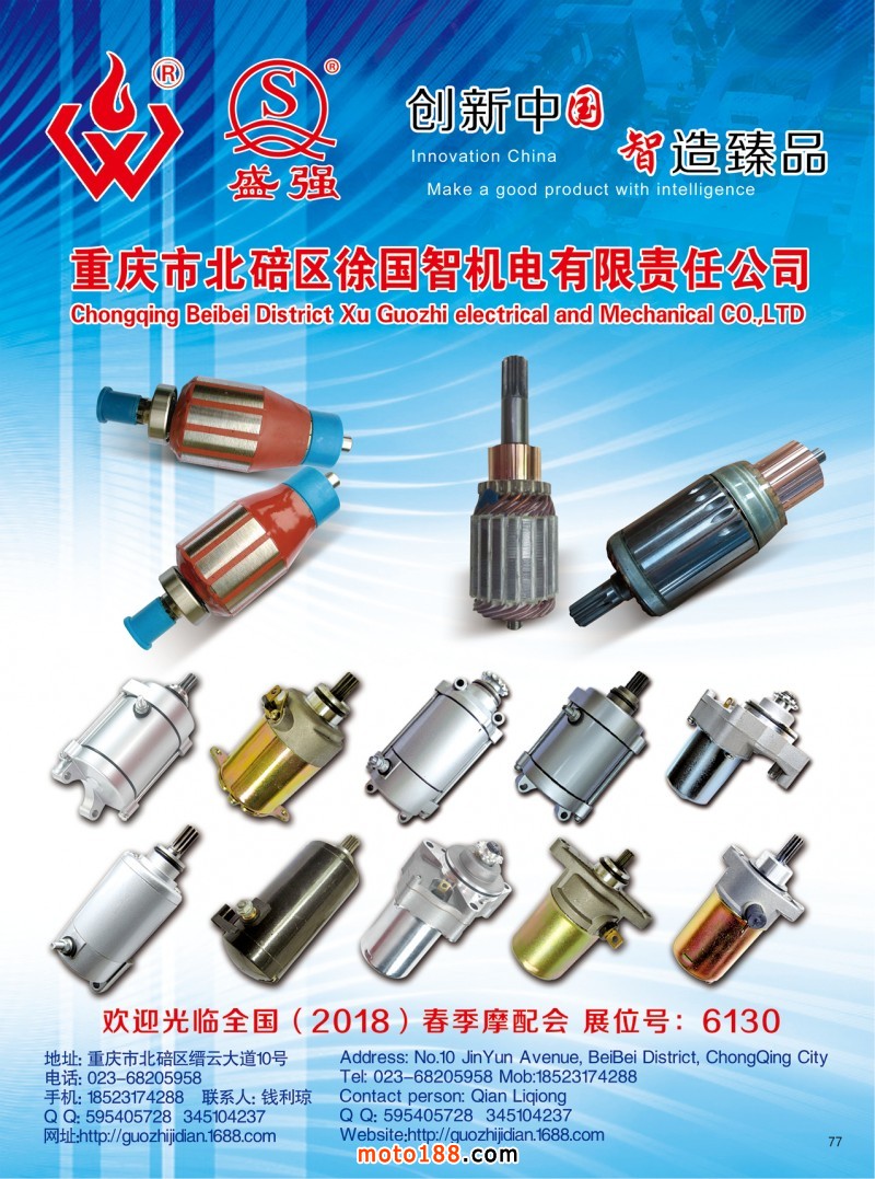 2018.5月《摩托車/電動車與配件》雜志,歡迎大家閱讀日期:2018-04-25 點擊:1895 查看原圖 全部展開![]() ![]() ![]() 內(nèi) 77 重慶市北碚區(qū)徐國智機電有限責(zé)任公司