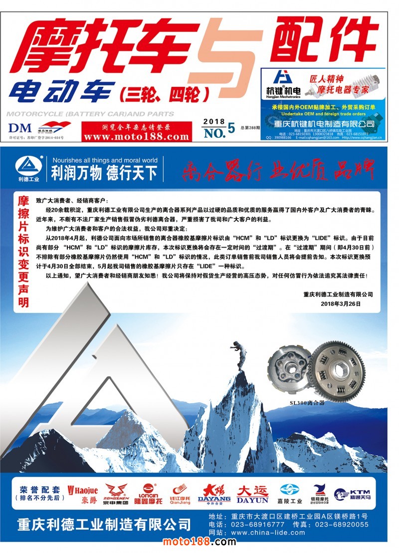 2018.5月《摩托車/電動(dòng)車與配件》雜志,歡迎大家閱讀日期:2018-04-25 點(diǎn)擊:1889 查看原圖 全部展開![]() ![]() ![]() 封面 重慶利德工業(yè)制造有限公司