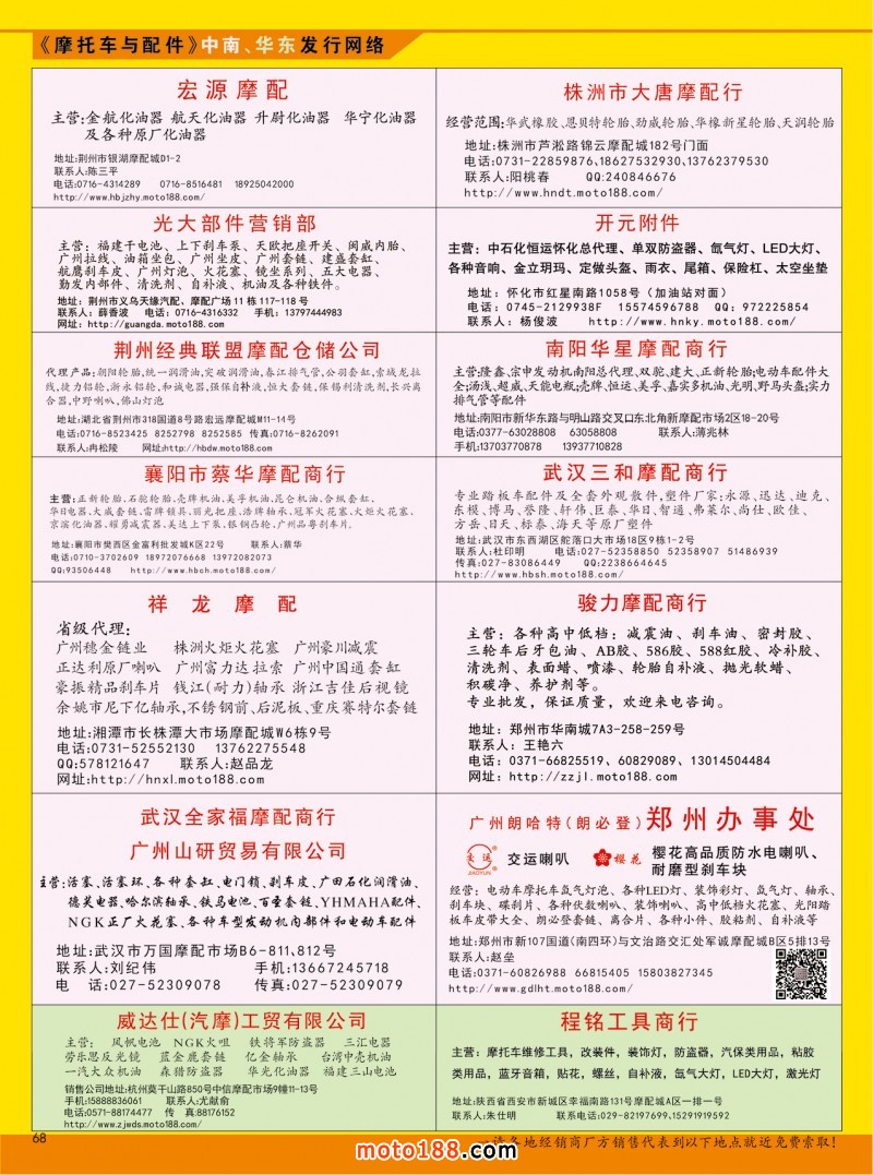 從現(xiàn)在到10月上旬,我們還將對16年編撰的《摩配華南市場指南》進行升級,中英文雙語出版,新版本將在下半年第76屆廣州全國摩托車及配件展示交易會首發(fā);并在廣州重慶摩配市場全面派送;在廣州福星、松南市場門口、及白云210/002/607三個檔口常年設(shè)立發(fā)行窗口;發(fā)行至廣州、重慶、江浙的主要廠家,目前收集整理、核對校正信息,編排翻譯的工作正在進行之中,需要在最新《華南市場指南》升級版做宣傳的企業(yè),請和我們以及各地的工作站人員聯(lián)絡(luò)。
