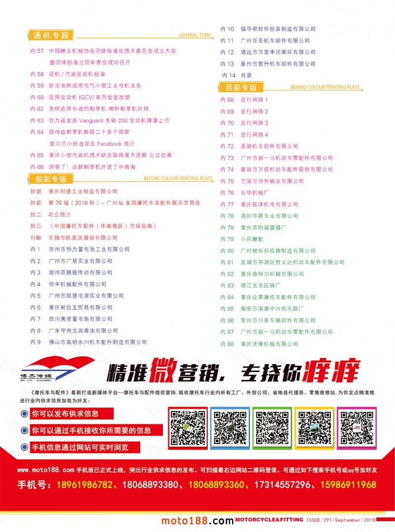 從現(xiàn)在到10月上旬,我們還將對16年編撰的《摩配華南市場指南》進行升級,中英文雙語出版,新版本將在下半年第76屆廣州全國摩托車及配件展示交易會首發(fā),歡迎參展企業(yè)和參展觀眾到3109展位領?。辉趶V州、重慶摩配市場全面派送,在廣州福星、松南市場門口、及白云210/002/607三個檔口常年設立發(fā)行窗口;發(fā)行至廣州、重慶、江浙的主要廠家,目前收集整理、核對校正信息,編排翻譯的工作正在進行之中,需要在最新《華南市場指南》升級版做宣傳的企業(yè),請和我們以及各地的工作站人員聯(lián)絡。