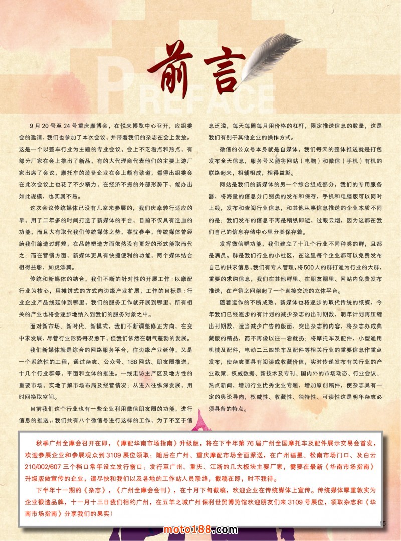 秋季廣州全摩會召開在即,《摩配華南市場指南》升級版,將在下半年第76屆廣州全國摩托車及配件展示交易會首發(fā),歡迎參展企業(yè)和參展觀眾到3109展位領(lǐng)??;隨后在廣州、重慶摩配市場全面派送,在廣州福星、松南市場門口、及白云210/002/607三個檔口常年設(shè)立發(fā)行窗口;發(fā)行至廣州、重慶、江浙的幾大板塊主要廠家,需要在最新《華南市場指南》升級版做宣傳的企業(yè),請盡快和我們以及各地的工作站人員聯(lián)絡(luò),截稿在即,時不我待。