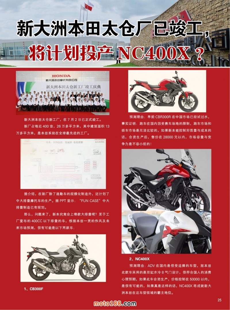 2018.10月《摩托車/電動(dòng)車與配件》雜志,歡迎大家閱讀日期:2018-09-28 點(diǎn)擊:1535 查看原圖 全部展開![]() ![]() ![]() 內(nèi)25 新大洲本田太倉(cāng)廠已竣工,將計(jì)劃投產(chǎn)NC400X