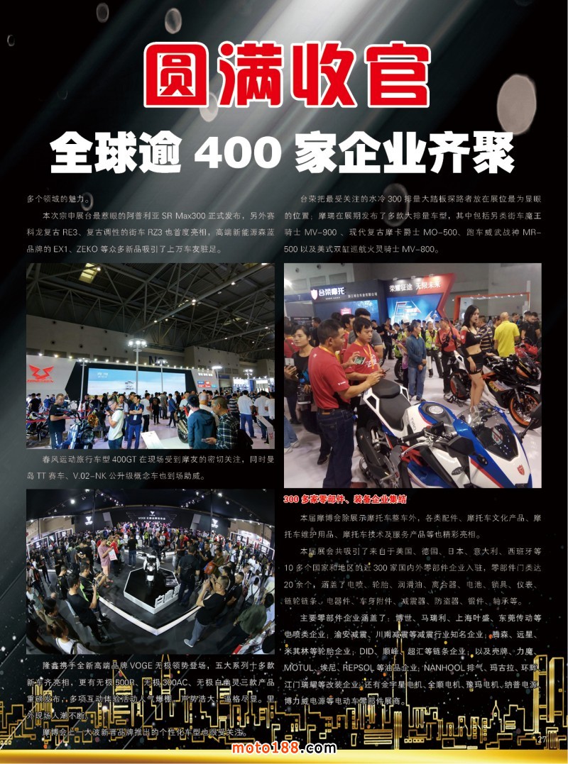 2018.10月《摩托車(chē)/電動(dòng)車(chē)與配件》雜志,歡迎大家閱讀日期:2018-09-28 點(diǎn)擊:1535 查看原圖 全部展開(kāi)![]() ![]() ![]() 內(nèi)27 2018中國(guó)摩博會(huì)圓滿(mǎn)收官