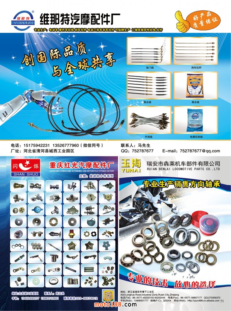 《摩托車與配件》(正在考慮是否變更為《電·摩配件》)不僅服務(wù)于摩配業(yè)之外,將重點增加電動車業(yè)(二、三、四輪)的信息服務(wù);同時增加小型通機內(nèi)容(涉及工、農(nóng)、林、牧、副、漁、建等產(chǎn)業(yè))信息服務(wù);壓縮出刊期數(shù),適當減少廣告的版面,突出雜志的內(nèi)容,增加原創(chuàng)內(nèi)容,增加可閱讀性,使雜志形成一定的風格,將雜志辦成典藏版的精品,每期都有收藏價值;改變現(xiàn)有發(fā)行模式,電子版將發(fā)送至每一個好友;紙質(zhì)版實行精準投放,有償發(fā)行,直達目標受眾,具體為每個市場的發(fā)行,按我們提供的名單,由發(fā)行代理送雜志上門,我們按數(shù)量直接支付現(xiàn)金作為發(fā)行費。權(quán)威性、收藏性、獨特性、可讀性這是明年雜志必須具備的特點。明年雜志特殊版面的征集工作已經(jīng)開始,壓縮期數(shù)后,特定版面的數(shù)量將減少,先定先得。