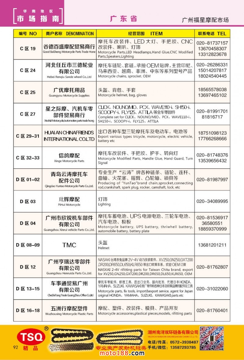 最新升級的《摩配華南市場指南》升級版在第76屆廣州全國摩托車及配件展示交易會上首發(fā),歡迎朋友們來3109號展位。接著將在廣州、重慶摩配市場全面派送,在廣州福星、松南市場門口、及白云三個檔口常年設(shè)立發(fā)行窗口;發(fā)行至廣州、重慶、江浙的幾大板塊主要廠家及全國的主要摩配市場。