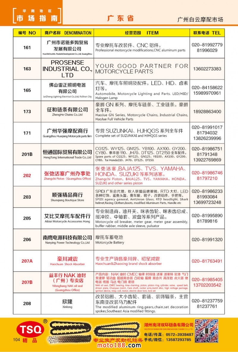 最新升級(jí)的《摩配華南市場(chǎng)指南》升級(jí)版在第76屆廣州全國摩托車及配件展示交易會(huì)上首發(fā),歡迎朋友們來3109號(hào)展位。接著將在廣州、重慶摩配市場(chǎng)全面派送,在廣州福星、松南市場(chǎng)門口、及白云三個(gè)檔口常年設(shè)立發(fā)行窗口;發(fā)行至廣州、重慶、江浙的幾大板塊主要廠家及全國的主要摩配市場(chǎng)。