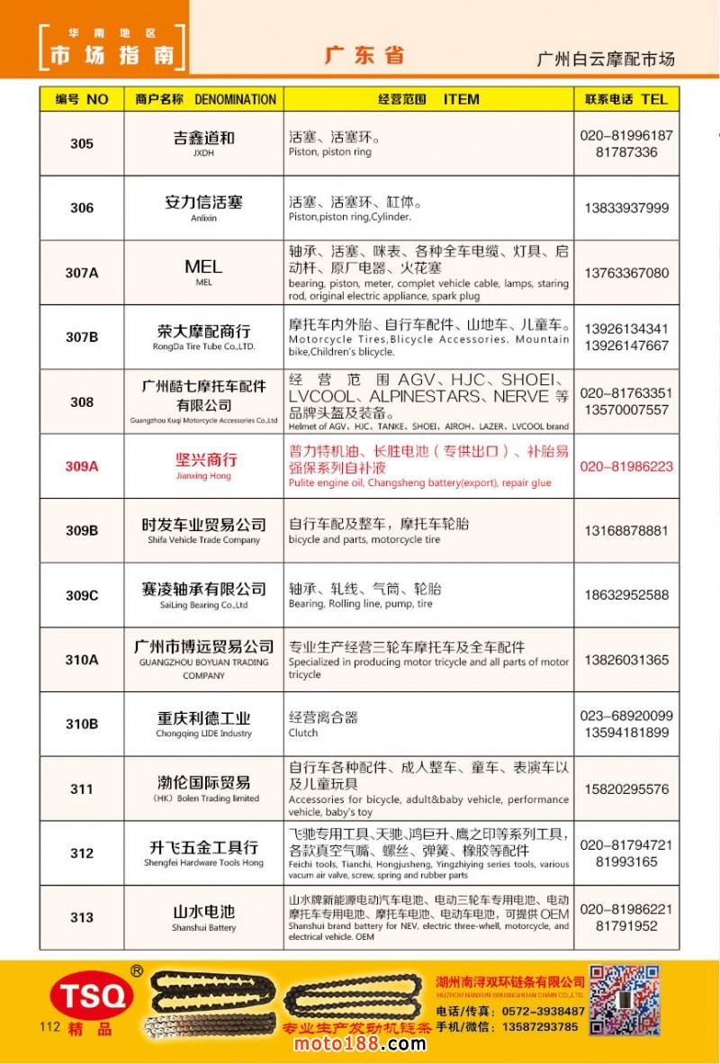 最新升級(jí)的《摩配華南市場(chǎng)指南》升級(jí)版在第76屆廣州全國摩托車及配件展示交易會(huì)上首發(fā),歡迎朋友們來3109號(hào)展位。接著將在廣州、重慶摩配市場(chǎng)全面派送,在廣州福星、松南市場(chǎng)門口、及白云三個(gè)檔口常年設(shè)立發(fā)行窗口;發(fā)行至廣州、重慶、江浙的幾大板塊主要廠家及全國的主要摩配市場(chǎng)。