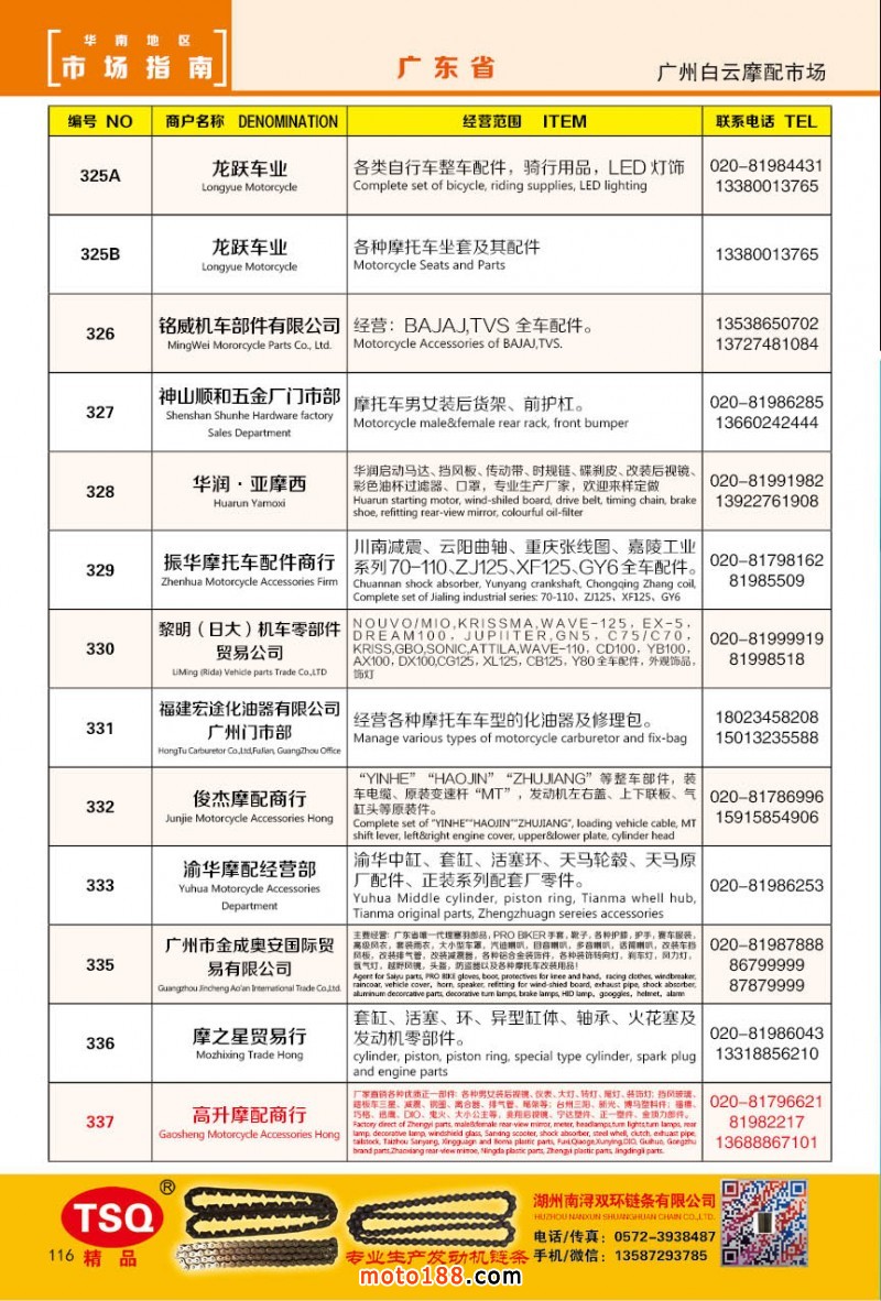 最新升級的《摩配華南市場指南》升級版在第76屆廣州全國摩托車及配件展示交易會上首發(fā),歡迎朋友們來3109號展位。接著將在廣州、重慶摩配市場全面派送,在廣州福星、松南市場門口、及白云三個檔口常年設立發(fā)行窗口;發(fā)行至廣州、重慶、江浙的幾大板塊主要廠家及全國的主要摩配市場。