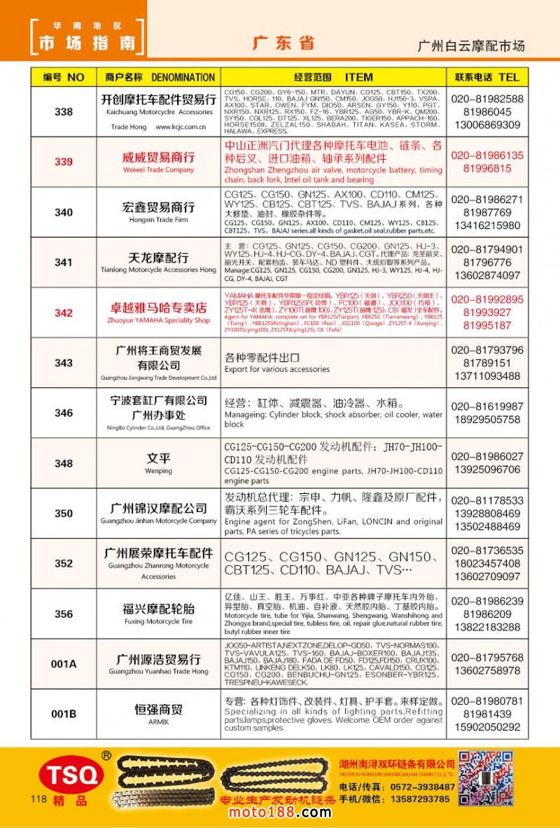 最新升級(jí)的《摩配華南市場(chǎng)指南》升級(jí)版在第76屆廣州全國(guó)摩托車(chē)及配件展示交易會(huì)上首發(fā),歡迎朋友們來(lái)3109號(hào)展位。接著將在廣州、重慶摩配市場(chǎng)全面派送,在廣州福星、松南市場(chǎng)門(mén)口、及白云三個(gè)檔口常年設(shè)立發(fā)行窗口;發(fā)行至廣州、重慶、江浙的幾大板塊主要廠家及全國(guó)的主要摩配市場(chǎng)。