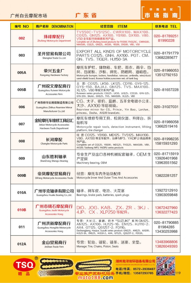 最新升級(jí)的《摩配華南市場(chǎng)指南》升級(jí)版在第76屆廣州全國(guó)摩托車及配件展示交易會(huì)上首發(fā),歡迎朋友們來3109號(hào)展位。接著將在廣州、重慶摩配市場(chǎng)全面派送,在廣州福星、松南市場(chǎng)門口、及白云三個(gè)檔口常年設(shè)立發(fā)行窗口;發(fā)行至廣州、重慶、江浙的幾大板塊主要廠家及全國(guó)的主要摩配市場(chǎng)。