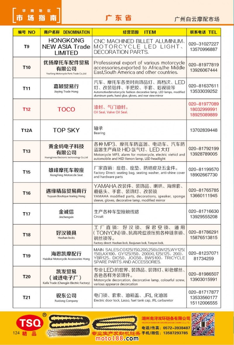 最新升級的《摩配華南市場指南》升級版在第76屆廣州全國摩托車及配件展示交易會上首發(fā),歡迎朋友們來3109號展位。接著將在廣州、重慶摩配市場全面派送,在廣州福星、松南市場門口、及白云三個檔口常年設(shè)立發(fā)行窗口;發(fā)行至廣州、重慶、江浙的幾大板塊主要廠家及全國的主要摩配市場。