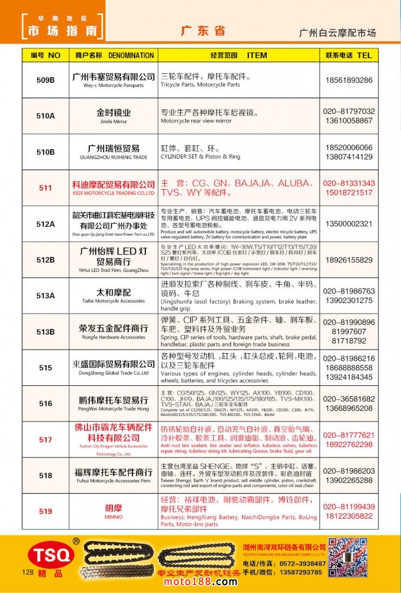 最新升級(jí)的《摩配華南市場(chǎng)指南》升級(jí)版在第76屆廣州全國摩托車及配件展示交易會(huì)上首發(fā),歡迎朋友們來3109號(hào)展位。接著將在廣州、重慶摩配市場(chǎng)全面派送,在廣州福星、松南市場(chǎng)門口、及白云三個(gè)檔口常年設(shè)立發(fā)行窗口;發(fā)行至廣州、重慶、江浙的幾大板塊主要廠家及全國的主要摩配市場(chǎng)。