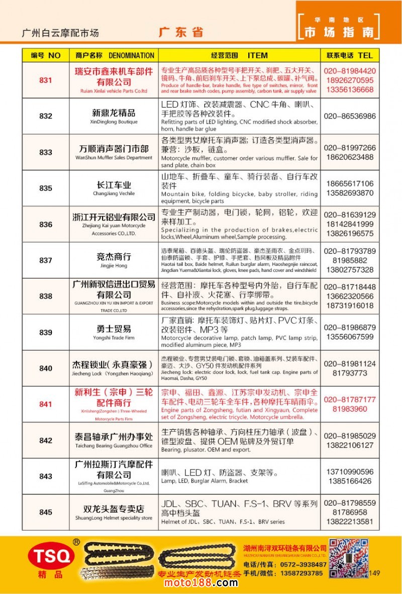最新升級的《摩配華南市場指南》升級版在第76屆廣州全國摩托車及配件展示交易會上首發(fā),歡迎朋友們來3109號展位。接著將在廣州、重慶摩配市場全面派送,在廣州福星、松南市場門口、及白云三個檔口常年設(shè)立發(fā)行窗口;發(fā)行至廣州、重慶、江浙的幾大板塊主要廠家及全國的主要摩配市場。