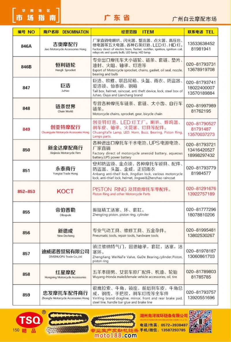 最新升級(jí)的《摩配華南市場(chǎng)指南》升級(jí)版在第76屆廣州全國(guó)摩托車及配件展示交易會(huì)上首發(fā),歡迎朋友們來3109號(hào)展位。接著將在廣州、重慶摩配市場(chǎng)全面派送,在廣州福星、松南市場(chǎng)門口、及白云三個(gè)檔口常年設(shè)立發(fā)行窗口;發(fā)行至廣州、重慶、江浙的幾大板塊主要廠家及全國(guó)的主要摩配市場(chǎng)。